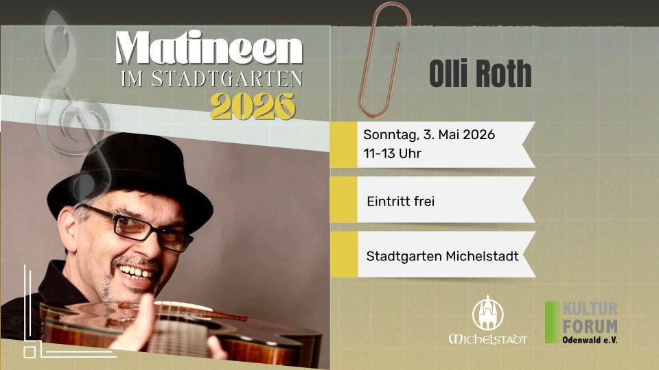 Den Auftakt der diesjährigen Matineen gestaltet am Sonntag, 3. Mai, der Musiker Olli Roth, der mit seinem Programm für einen entspannten musikalischen Start in den Sonntag sorgt. Am Sonntag, 10. Mai, präsentieren Schülerinnen und Schüler der Musikschule Odenwald ihr Können und bringen eine abwechslungsreiche musikalische Mischung in den Stadtgarten. Den Abschluss der Reihe bildet am Sonntag, 17. Mai der Auftritt von Marvin Scondo, der das Publikum mit seiner Musik in sommerlicher Atmosphäre durch den Vormittag begleitet.