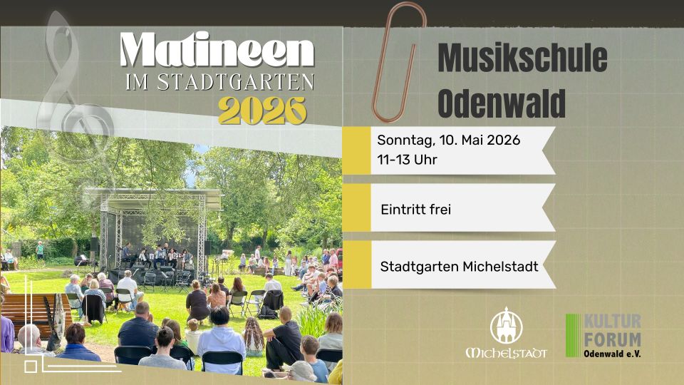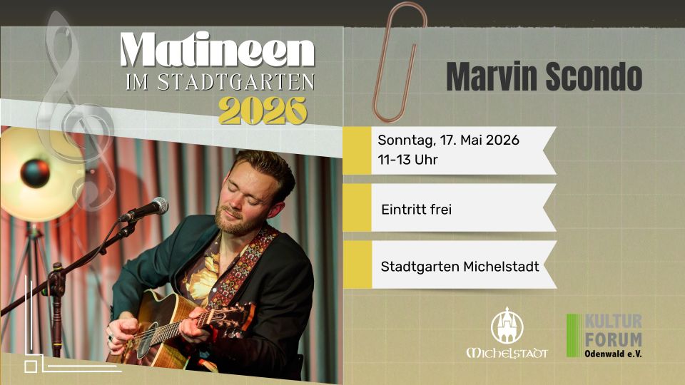 Den Auftakt der diesjährigen Matineen gestaltet am Sonntag, 3. Mai, der Musiker Olli Roth, der mit seinem Programm für einen entspannten musikalischen Start in den Sonntag sorgt. Am Sonntag, 10. Mai, präsentieren Schülerinnen und Schüler der Musikschule Odenwald ihr Können und bringen eine abwechslungsreiche musikalische Mischung in den Stadtgarten. Den Abschluss der Reihe bildet am Sonntag, 17. Mai der Auftritt von Marvin Scondo, der das Publikum mit seiner Musik in sommerlicher Atmosphäre durch den Vormittag begleitet.